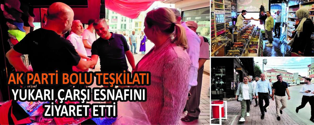 Esnafla hasbihal eden AK Parti Teşkilatı, esnafın derdini dinledi. Yapılan esnaf ziyareti Bolu AK Parti İl Başkanlığı sosyal medya hesabından şu sözlerle paylaşıldı; “Yukarı Çarşı esnafımızı ziyaret ederek hem hasbihal ettik hem de hayırlı işler diledik. Hoş sohbetleri ve yakın ilgileri için tüm esnaflarımıza teşekkür ediyor, bol kazançlı ve bereketli işler diliyoruz.”