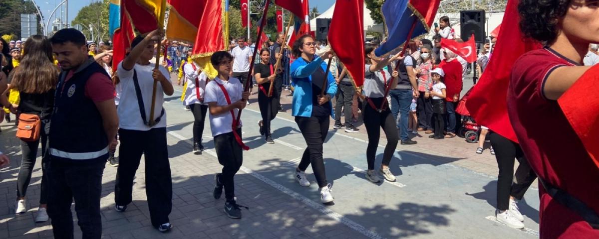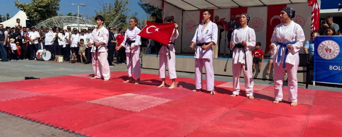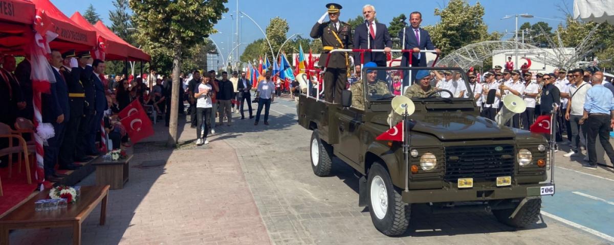 Bolu Valisi Erkan Kılıç, Belediye Başkanı Tanju Özcan ve Garnizon Komutan Yardımcısı İslam Can resmi tören aracı üstünden halkı, askerleri ve öğrencileri selamladı. Şiirlerin okunması, halk oyunları gösterilerinin ardından yurt içinde ve yurt dışında ödüller kazanan sporculara hediyelerin verilmesinin ardından tören geçişine geçildi.
