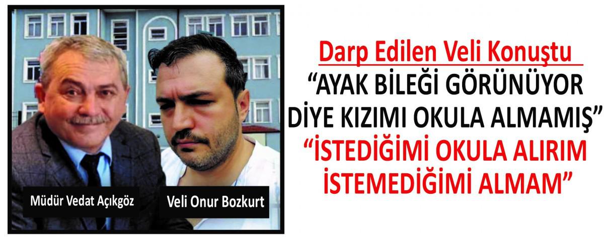 Kızının eve gelerek pantolon paçasının iki santim kısa olması ve ayak bileğinden teninin göründüğü için okula alınmadığını söylediğini anlatan Onur Bozkurt, “Kızım öğretmenine çorabımı çekeyim demesine rağmen evine gönderilmiş. 80 tane daha öğrenciyi aynı gün cezalandırarak evlerine göndermişler. Bende bu duruma sinirlenerek okula gittim. Okulun bahçesinde “Sizin eğitim hakkınızı kısıtlayan” kim dediğimde okul müdürü yanıma gelerek burada bağıramayacağımı söyledi. Kızımın üzerinde mavi forması ve altında siyah pantolonunun olduğunu ve bunun neden sıkıntı olduğunu sorduğumda da paça boyunun sıkıntı olduğunu söyledi. O da “Ben burada ne dersem o olur. İstediğimi okula alırım istemediğimi almam” şeklinde cevap verdiğinde daha da sinirlendim. Müdür ile tartışırken bana 2-3 kez yumruk salladı. Yumruklardan biri yüzüme geldi. Öğretmenler araya girip beni dışarı çıkartmak isterken okul müdürü hala saldırmak için peşimden geliyordu. Bir velinin çocuğunun gözü önünde darp edilmemesi lazım. Paça boyu kısalığından teni görünüyor gibi sebeplerle darp edilmek çok üzücü” diye konuştu.