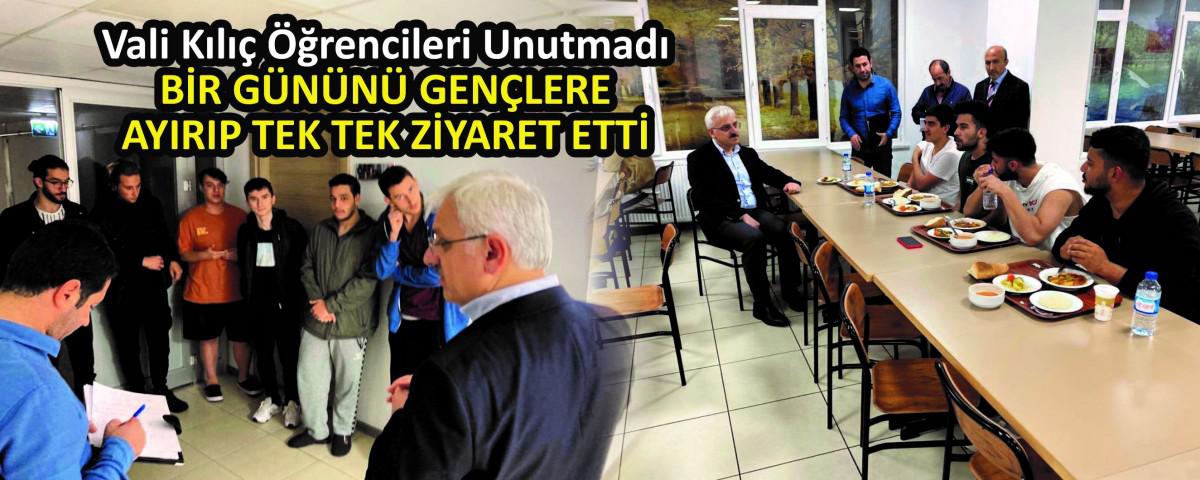 Bolu'da bulunan GSB Öğrenci yurtlarının tümünü ziyaret eden Vali Kılıç, "Gençlerimizle birlikte olmaktan, taleplerini ve fikirlerini dinlemekten memnuniyet duydum. Her bir gencimize zihin açıklığı ve başarılar diliyorum" dedi.