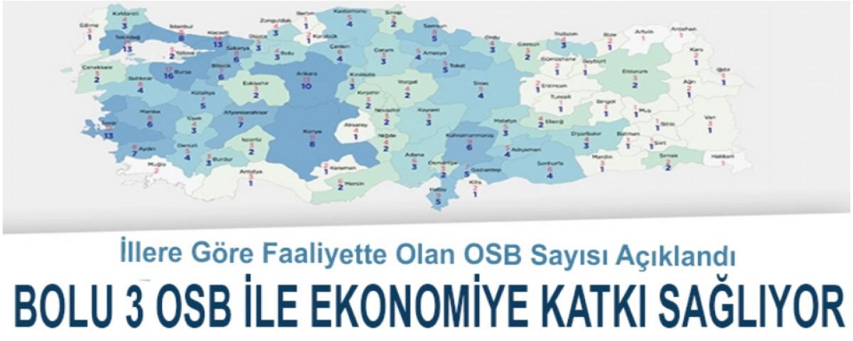 Kuruluş onayı verilen ve faaliyette olan OSB'ler listesin bakıldığında Bolu'da Kuruluş onayı verilen ve faaliyette OSB 4 olarak görülüyor. Bolu'daki 4 OSB'nin 3'ü ise faaliyette bulunuyor.