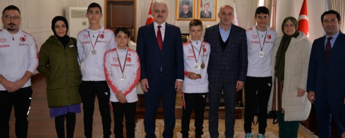 Sporcuların Vali Erkan Kılıç'ı ziyaretine, Gençlik ve Spor İl Müdürü Emrullah Güler, Antrenör Caner Güzeltürk, Trampolin Cimnastik Milli Takımı Bolu TOHM sporcularımız Sinan Cankurt, Batuhan Meriç Mamur, Emir Öztürk, Fahreddin Duman ve sporcularımızın aileleri katıldı.