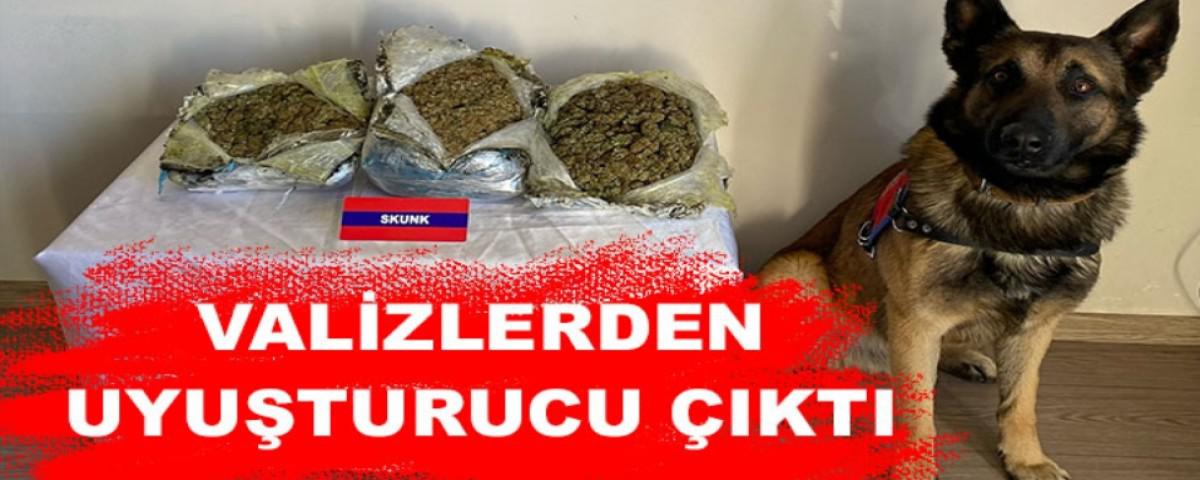 Narkotik köpeği “Asır” ile otobüse yapılan operasyonda 2 yolcuya ait valizlerde 3 kilo 250 gram skunk ve 2 kilo esrar ele geçirildi. Gözaltına alınan 2 yolcu ifadeleri alınmak üzere jandarma komutanlığına götürüldü.