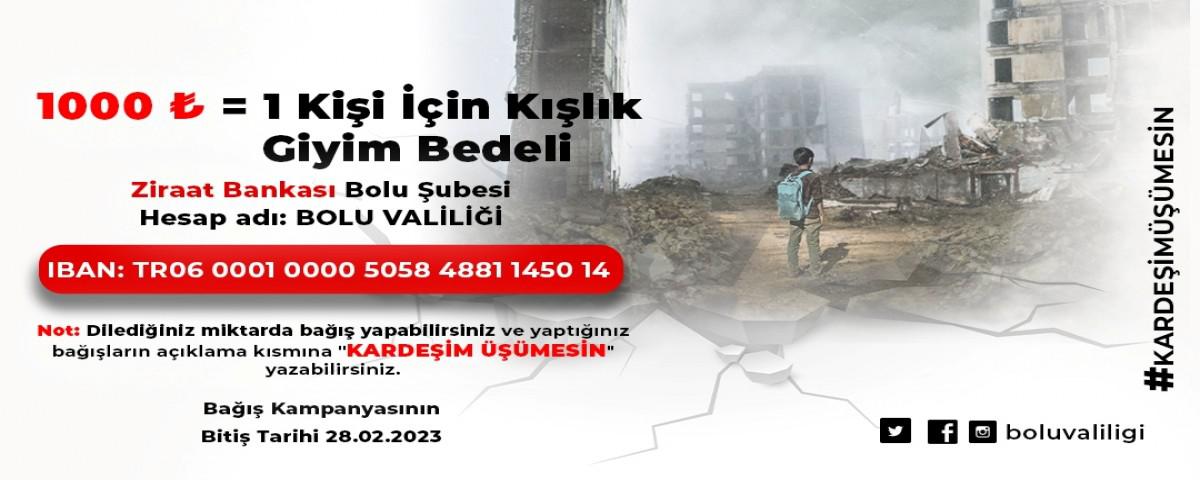 Depremzedelere bot ve kışlık kıyafet alınması için başlatılan kampanyayla ilgili Bolu Valiliği'nden yapılan açıklamada, “Bolu Valiliği koordinasyonunda deprem bölgesinden ilimize gelen misafirlerimiz için bağış kampanyasına desteklerinizi bekliyoruz. 1 kişi için kışlık giyim bedeli bin liradır. Dilediğiniz miktarda bağış yapabilirsiniz ve yaptığınız bağışların açıklama kısmına “kardeşim üşümesin” yazabilirsiniz. Bağış kampanyasının bitiş tarihi 28 Şubat'tır” denildi.