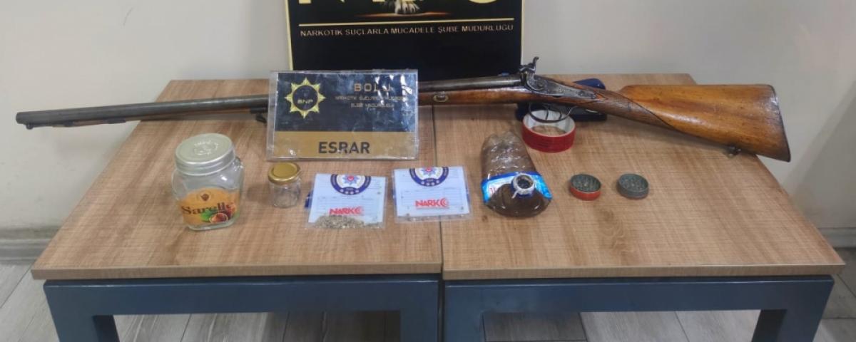 Ayrıca, yapılan ev aramalarında 1 şahsın ikametinde 2,54 gr gelen hint keneviri tohumu, 1 adet uyuşturucu madde içiminde kullanılan pet şişe düzeneği, 1 adet uyuşturucu madde öğütme aparatı (grinden), 1 adet üzerinde herhangi bir ibare bulunmayan ruhsatsız av tüfeği bulundu.