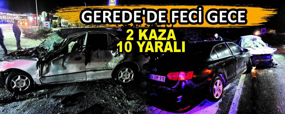 Bolu'nun Gerede ilçesi Çayörengüney köyü mevkiinde dün gece saatlerinde gizli buzlanma nedeniyle 45 dakika arayla iki farklı zincirleme trafik kazası meydana geldi. Saat 04.20 sıralarında Gerede istikametine seyir halinde olan 3 otomobil ile 1 kamyonet kar ve soğuk nedeniyle buzlanma yaşanan yolda kontrolden çıkarak kaza yaptı. Kazada araçlarda bulunan 5 kişi yaralandı. İhbar üzerine olay yerine 112 Sağlık ve itfaiye ekipleri sevk edildi. Hurdaya dönen otomobillerde sıkışan 3 kişi ekiplerin çalışması sonucu yaralı olarak kurtarıldı.