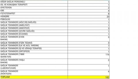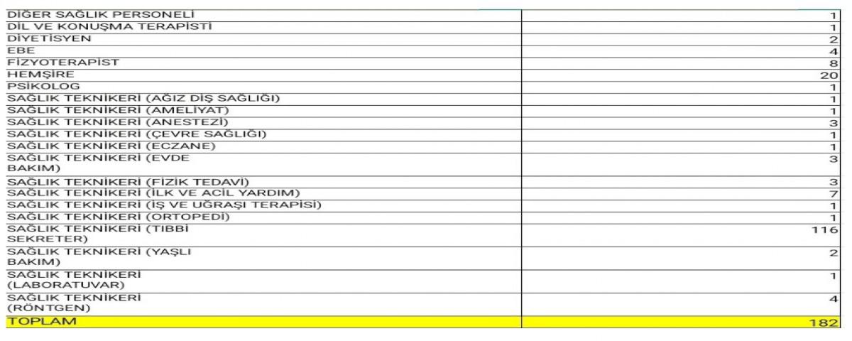 "28 lisans mezunu biyolog, 102 lisans mezunu çocuk gelişimci, 100 lisans mezunu diğer sağlık personeli, 41 lisans mezunu dil ve konuşma terapisti, 255 lisans mezunu diyetisyen, bin 530 lisans mezunu ebe, 510 lisans mezunu fizyoterapist, 867 ortaöğretim ve 5 bin 202 lisans mezunu olmak üzere toplam 6 bin 69 hemşire, 28 lisans mezunu iş ve uğraşı terapisti (ergoterapist), 26 lisans mezunu odyolog, 25 lisans mezunu perfüzyonist, 255 lisans mezunu psikolog, 33 lisans mezunu sağlık fizikçisi, 91 lisans mezunu sosyal çalışmacı, 21 bin 709 ön lisans mezunu ve 798 ortaöğrenim mezunu çeşitli sağlık teknikeri"