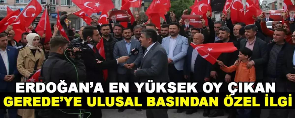 Cumhurbaşkanlığı seçimlerinde adaylardan Recep Tayyip Erdoğan'a en yüksek destek verilen Bolu'nun Gerede ilçesi ulusal basının ilgisiyle karşılaştı. İlçede Erdoğan'a yüzde 84 oy verilmesiyle dikkatleri üzerine çeken Gerede, yakın markaja alındı. Ulusal bir kanal ilçeye giderek ikinci tur öncesinden vatandaşlarla röportaj yaptı.
