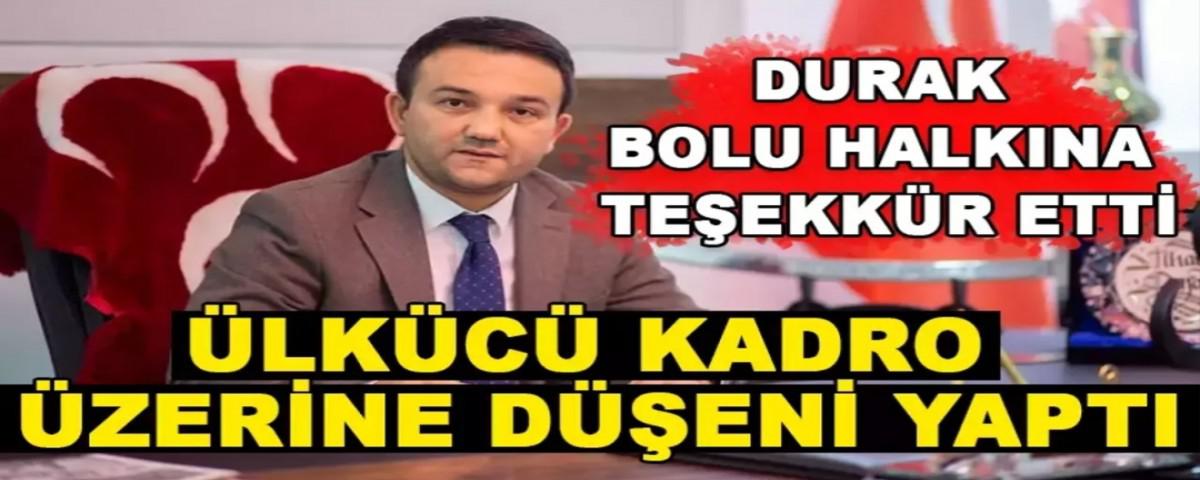 Bolu halkının Cumhurbaşkanlık seçimlerinde milli bir duruş sergilediğini belirten MHP İl Başkanı İlhan Durak, “Seçimden öncede defalarca dile getirdiğim gibi, Bolu halkının ferasetine her zaman güvendik. Halkımız bu güvenimizi boşa çıkartmadı. Bizlerde inşallah onların bize olan güvenini boşa çıkartmayacak. Halkımız 28 Mayıs'ta tavrını istikrardan ve Türkiye Yüzyılından yana koymuştur. Yerli ve Milli bir duruş sergilemiştir. Cumhur İttifakının oylarını %60'tan %64'e çıkartmıştır. Tüm vatandaşlarımıza göstermiş oldukları bu teveccühten dolayı sonsuz teşekkür ediyorum. Allah onlardan razı olsun. Ne kadar necip bir millet olduğumuzu bir kez daha gösterdiler” ifadelerine yer verdi.