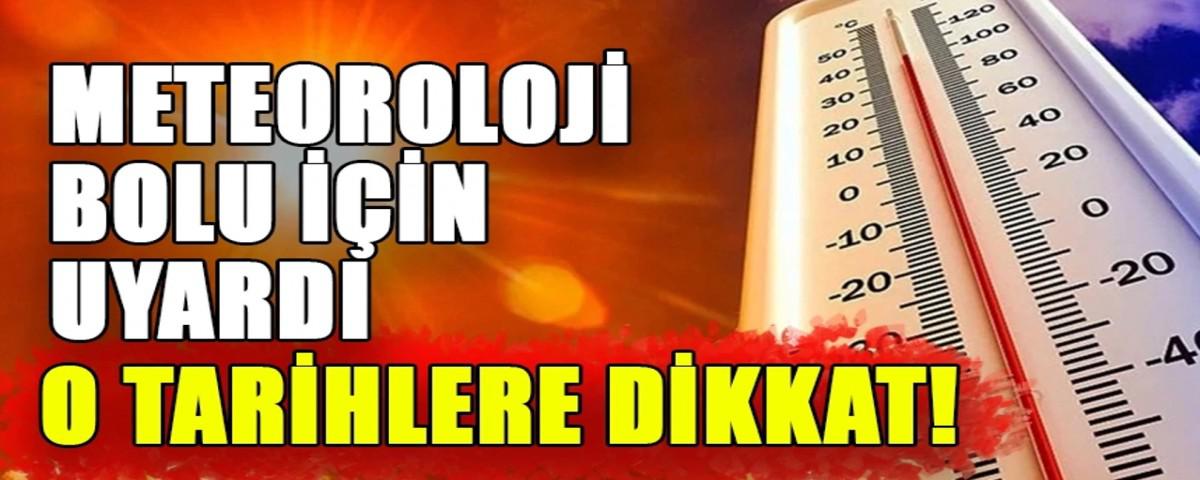 Meteoroloji Genel Müdürlüğü, hava sıcaklığınınyarından itibaren Bolu genelinde normalin üzerine çıkacağını söyledi: “Kronik rahatsızlığı olanlar, yaşlılarımız ve çocuklarımız başta olmak üzere vatandaşlarımızın günün en sıcak saatleri olan 11 ile 16 saatleri arasında dikkatli ve tedbirli olmaları gerekmektedir”