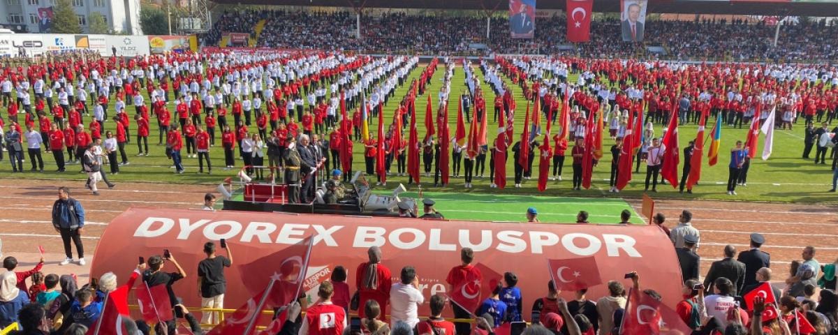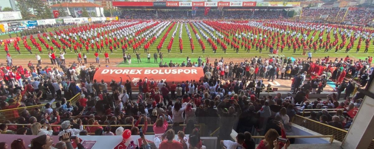 Atatürk Stadyumu'nun kapasitesinin üstünde insan seli yaşadığı 100. Yıl kutlamaları saygı duruşu ve İstiklal Marşı'nın okunmasıyla başladı. Bolu Valisi Erkan Kılıç'ın selamlama konuşmasının ardından öğrencilerin halk oyunları izleyenlerden büyük alkış aldı.