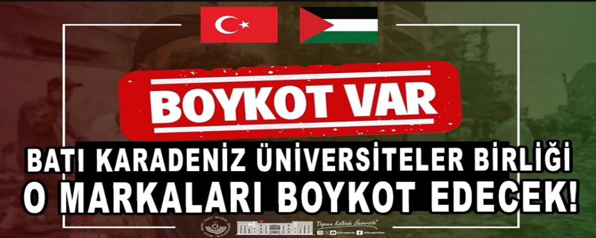 Desteklerin eyleme dönüşmesi gerçekliğinin bir örneği olarak İsrail ordusunu besleyen şirketlerin ürünlerini kullanmamak ve bu yönde bir boykot uygulamak hafife alınmayacak bir destek olacaktır. Bu doğrultuda Batı Karadeniz Üniversiteler Birliğinde yer alan 17 üniversite olarak Filistin'de işlenen insanlık suçlarına sessiz kalmamak ve zulme ortak olmamak için İsrail'e destek veren markaların ürünlerini boykot etme kararı aldığımızı kamuoyu ile paylaşıyoruz.