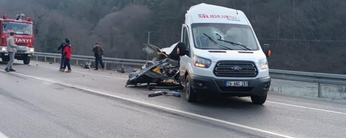 Bolu'dan Mudurnu istikametine giden Arif K. yönetimindeki 14 AAC 261 plakalı Şirin Mudurnu Seyahate ait yolcu minibüsü ile karşı istikamette seyreden Dursun D. idaresindeki 54 SB 694 plakalı yem kamyonu Akkayalar mevkisinde çarpıştı.