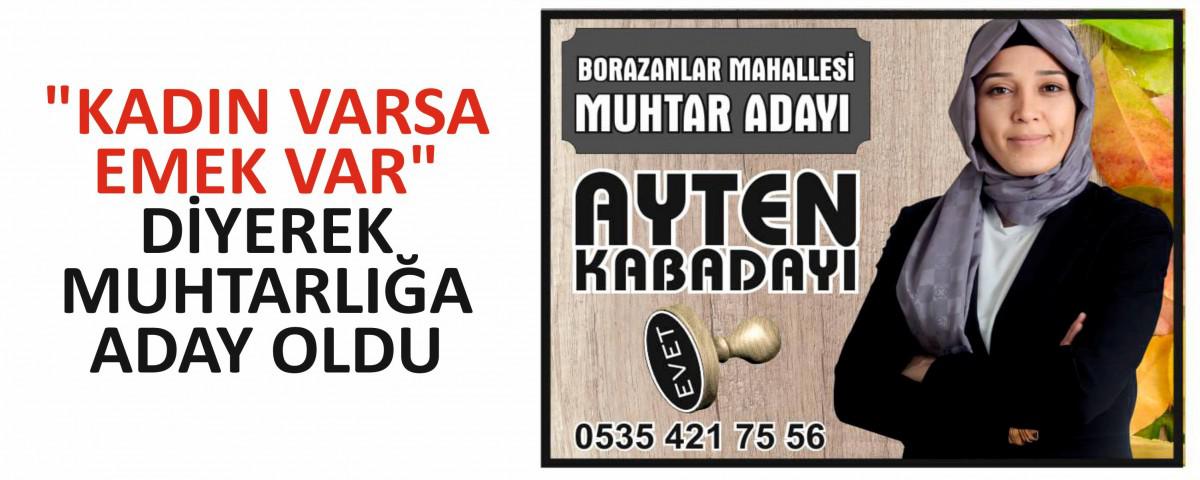 Bolu merkez Borozanlar Mahallesi muhtar adaylığını açıklayan Ayten Kabadayı, yerel seçimlerde mahallesinden muhtar adayı olduğunu açıkladı. Bolu doğumlu, 38 yaşında evli ve üç çocuk annesi olan Ayten Kabadayı, ilk, orta ve Lise öğrenimini Bolu'da okudu. Yaklaşık 10 yıl halı ve koltuk yıkama ve temizlik sektöründe esnaflık yapan Ayten Kabadayı, mahallesinden destek istedi. Kabadayı, "Borozanlar isimde kalmasın, daha aydın, daha temiz, daha yeşil, daha güzel bir mahalle için yerel seçimlerinde desteklerinizi bekliyorum. Sakini ve hizmetlerine talip olmaktan onur duyduğum Borozanlar Mahallemizin değerli sakinlerimize; destek sizden hizmet bizden diyor, selam sevgi ve saygılarımı sunuyorum." dedi.