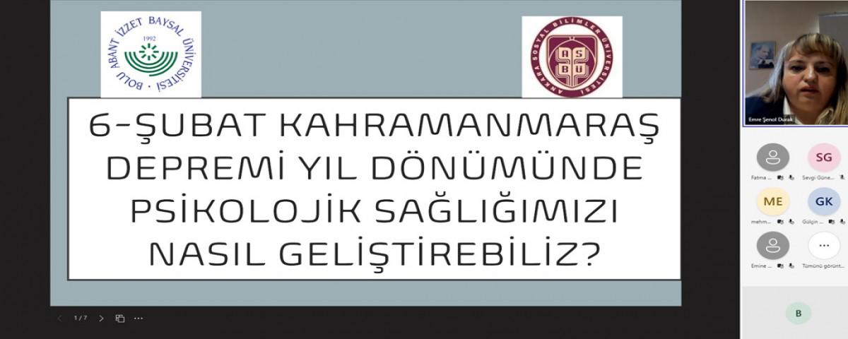 Webinarın moderatörlüğünü de yapan Üniversitemiz Fen Edebiyat Fakültesi Psikoloji Bölümü Öğretim Üyesi Prof. Dr. Emre Şenol Durak, “Deprem Sonrası Psikolojik Dayanıklılık” başlıklı bir sunum gerçekleştirdi. Kahramanmaraş merkezli iki büyük depremin sonuçlarının ve benzeri süreçlerin psikolojik etkilerini iyileştirmenin uzun yıllar alabildiğini kaydeden Prof. Dr. Durak, depremi yaşayanların yanı sıra basın aracılığı ile durumu takip edenlerin de bu süreçlerden etkilendiğini söyledi.