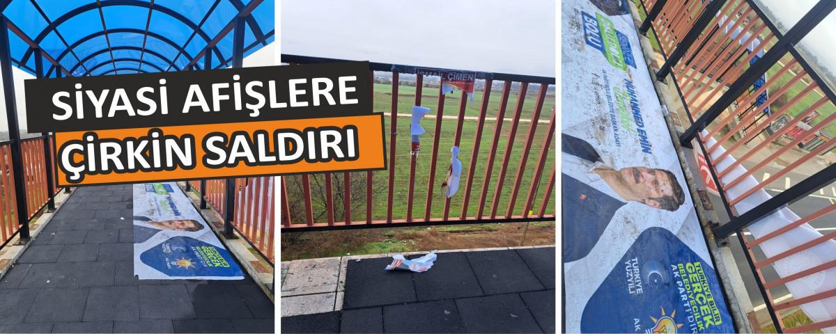 Bolu'da D-100 karayolu üzerinde bulunan bir üst geçitte, seçim öncesi asılan siyasi parti afişlere kimliği belirsiz kişiler tarafından zarar verildi. Ak Parti Belediye Başkan Adayı Muhammed Emin Demirkol ve Paşaköy Mahallesi Muhtar Adayı İsmail Çimen'in seçim afişlerin bir kısmı yırtılırken, bir kısmı da yerlere atılarak zarar verildi. Üst geçitte boş alkol şişelerinin de olduğu dikkat çekti.
