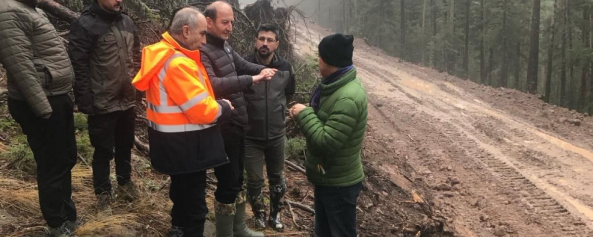 Bolu Orman Bölge Müdürlüğüne ait dozer ve ekskavatör ile yapılan Çökeren Orman İşletme Şefliği 011- 013 kod nolu yeni yol çalışmaları hakkında İşletme Müdürü Osman Özdemir'den bilgi alan Bölge Müdür Yardımcısı Kemal Yıldız yapılan çalışmalar için personele teşekkür ederek işlerinde kolaylıklar diledi.