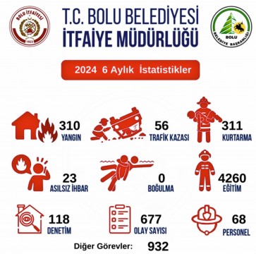 2024 yılının 6 ayı kapsayan istatistik verilerine göre Bolu İtfaiyesi'nin istatistik verilerinde; 310 yangın, 56 trafik kazası, 311 kurtarma, 23 asılsız ihbar, 4260 eğitim 118 denetim, 677 olay sayısı, 68 personel ve 932 diğer görev yer alıyor.