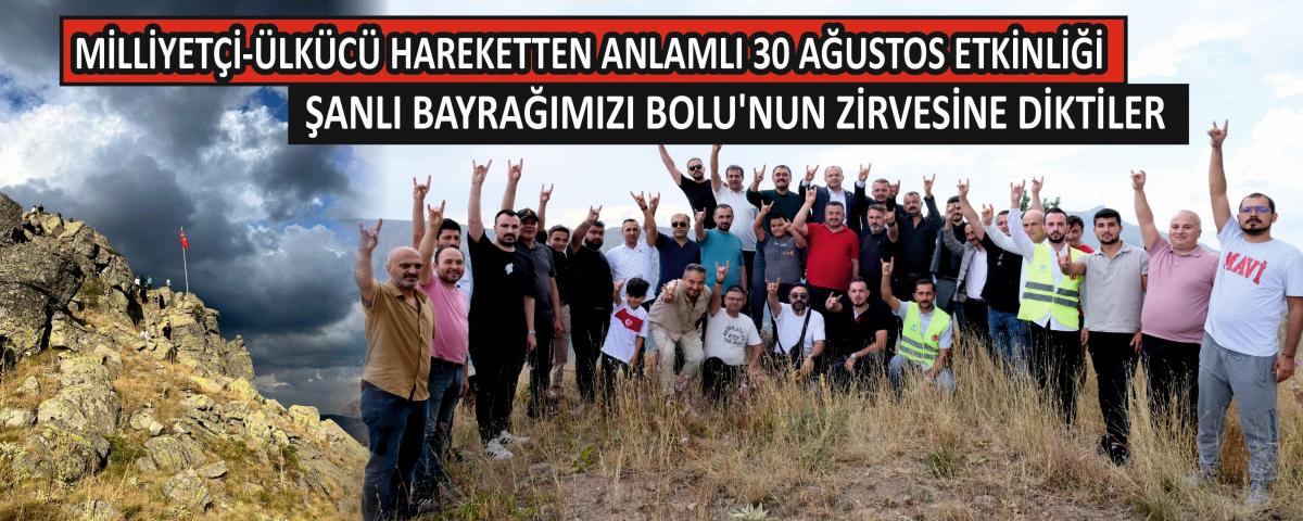 Milliyetçi-Ülkücü Hareketin temsilcileri Zafer Bayramı dolayısıyla Bolu'nun en yüksek noktalarından biri olan Köroğlu Dağı zirvesine çıktılar. Köroğlu Dağı zirvesine bağımsızlığımızın sembolü şanlı Türk Bayrağımızı diken MHP ve Ülkü Ocakları Bolu Teşkilatları hep birlikte bayrağımızı korumaya and içtiler.