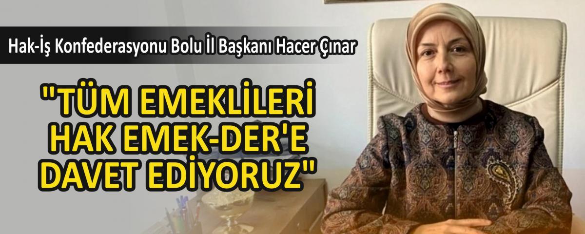 HAK EMEK-DER'i emeklilerin birlik ve beraberliğinin adresi ve hak mücadelesinin merkezi yapmaya davet ettiklerini söyleyen Hacer Çınar, “Bütün bu kazanımların elde edilmesinde, HAK-İŞ ve ona bağlı sendikaların oluşturduğu güçlü temsil yapısının önemi reddedilemez. Bugün bu temsil halkına yeni ve büyük bir toplumsal grup olan emeklilerin katılma zamanı gelmiştir. Mevzuat yapımızda emeklilerin sendikal örgütlenmesi önündeki engeller nedeniyle dernek çatısı altında başladığımız örgütlü yürüyüşümüzün kısa zamanda sendikal harekete dönüştürmek için elimizden gelen çabayı da göstereceğiz. Başta hayat pahalılığı ve emeklilik dönemi destekleri olmak üzere, üyelerimizi ilgilendiren her alanda bilimsel ve teknik çalışmalar yaparak karar vericileri etkileme gayreti içinde olacağız. Emeklilik dönemi için ortaya çıkan ihtiyaçları bir lütuf olarak değil hak temelli mücadelemizin bir sonucu olarak elde etme mücadelesi yürüteceğiz. HAK-İŞ'imizin insani ve ahlaki değerlere dayalı mücadelesinin kapsamını emeklilerle daha da büyüteceğiz.