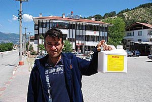 Mudurnu ilçesinde Hacet Bayramı yapmak için hazırlık yapan köy muhtarları, Hacet Bayramının yapılacağı alanı ilaçlamak için İlçe Tarım Müdürlüğü?nden kene ilacı alıyor.
