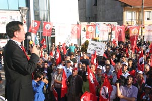 Mitingde konuşan Osman Pamukoğlu, iktidar olduklarında yapacakları icraatları anlattı. Ardından da hükümetin kürt açılımı politikasına değindi. Ülkenin diğer ülkelere peşkeş çekildiğini söyleyen Pamukoğlu, PKK ile savaşın yanlış politika izlendiği için sonuç vermediğine değindi. Osman Pamukoğlu teslim alınan PKK?lı teröristlerle Silopi Mütarekesi yapıldığını söyledi. Hak ve Eşitlik Partisi Genel Başkanı Pamukoğlu; ?Silopi?de teslim alındığı iddia edilen PKK?lı eşkiyalar aslında teslim alınmadı. Sadece yapılan Silopi Mütarekesi?nin bir maddesi yerine getirildi. Bu ülke çok haksızlıklara uğradı, çok ezildi. Ancak bu kadar büyük bir satışın örneğini görmemişti. Şimdi onu da gördü. Yani tarihler boyu bağımsız bir ülke olarak yer alan Türkiye bağımsızlığından yavaş yavaş feragat etmeye başladı. Bağımsızız diyorlar. Bayrak ebatlarını büyüterek bağımsız olunmaz? diye konuştu.