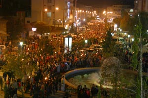 Kardelen Meydanı?nda toplanan kalabalık daha sonra ellerinde Türk bayrakları, Atatürk resimleri ve meşalelerle Belediye önüne kadar yürüdü ve ?Şehitler ölmez vatan bölünmez?, ?Kahrolsun PKK?, ?Mustafa Kemal?in askerleriyiz? gibi sloganlar attı. Belediye önünde toplanan kalabalık daha sonra olaysız bir şekilde dağıldı.