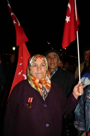 CHP?nin düzenlediği Fener Alayı?na şehit aileleri de katıldı. Oğlu Kıbrıs?ta şehit olan yüreği yanık bu teyze de oğlunun madalyasını takıp elinde Türk bayrağıyla, Hükümet Meydanı?ndaki yerini aldı. Teröre lanet eden şehit anası, zaman zaman duygulu anlar yaşadı.