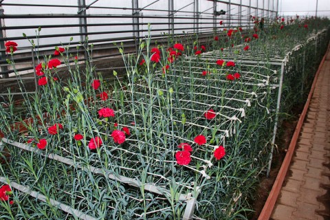 Z.Y.Müh. İlknur Özkök Kaşıkçı: Kesme karanfilin dikiminden, büyümesine kadar emek harcanıyor. Kesme karanfil 20 cm büyüyor, 1. Kat ipleri çekiliyor. 10 cm.lik kare kare ipler çekilip, ilk kat koruması sağlanıyor. Büyüdükçe 2. Kat ipi çekiliyor. 3. kak, 4. kat diye bu şekilde kat kat işlem yapılıyor. Çiçekler boylandıkça eğrilmesin, kırılmasın, bükülmesin diye ip çekiliyor. Bu şekilde uygulamalar yapılıyor. Buradaki uzun boylular kesme çiçekçilikte kullanılacak. Bunların hepsi buket yapmada, çelenk yapmada kullanılacak şekilde olan çiçekler.