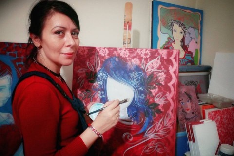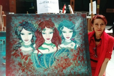 Öğr. Gör. Şafak Erdem; “Kendi kültürümüzde, kendi topraklarımızda ne var, ben bu resme ne gibi simgeler ekleyebilirim? Belki bir bitki örüntüsünden tutunda, ben buraya herhangi bir çiçek yapmıyorum mesela. Kendi çevremdeki, örneğin Abant’taki nilüferi belki tercih ediyorum. Ya da onu hikâyeleştiriyorum. Kendi alanında öyle bir çabam var aslında. Daha da şekillendirmek istiyorum onları. Mesela daha böyle ansiklopedik bir dille, çiçeğin kendi hikâyesini eklemek istiyorum karakterlere. 100’e yakın var bu karakterlerden. Bana göre hepsinin öyküsü ayrı, hikâyesi ayrı. Hepsinde ayrı tema var, ayrı renkler. Rengi ayrı kullanmam bile onun öyküsünü değiştiriyor benim için. Portreyi hep ortada tutuyorum, hatta bedeni bile almıyorum. Varmış gibi algılıyorum bedeni. Benim için önemli olan, onun dışında yarattığım doğanın içinde kaynaşması. Canlı ve zıt renklerin birbirini etkilemesini de çok seviyorum.