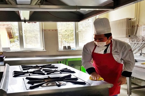 Covid-19 salgını sürecinde İzzet Baysal Abant MTAL’de yapılan çalışmaları ve alınan önlemleri aktaran okulun Öğretmen Atilla Demirer; “Corona sürecinde okulumuzda bizde elimizden geldiğince tedbirlerimizi almaya çalıştık, Tv den öğrendiklerimiz, bilim kurulunun anlattıkları çerçevesinde. Özellikle Türk Kızılay’ı ile yaptığımız yemek dağıtımı oldu. Yeni başladığı dönemde bazı kişiler panik havasındaydı. Biz yemek dağıtımında, özellikle arkadaşlar arasında mesafe koymaya çalıştık. Yemek dağıttığımız koridorda giriş çıkışları düzenledik. Farklı bir noktadan giriş yapmalarını sağlayıp, farklı bir noktadan da çıkış yapmalarını sağladık. Sosyal mesafe ile ilgili uyarı yazıları astık birçok noktaya. Mutfak gibi yerlerin dışarıdan temasını engelleyecek şekilde komple kapattık. Mutfağa, yemekhaneye ilaçlama yaptırdık. Okul binasını dezenfeksiyondan geçirdik. Girişte ateş ölçümü, maske, dezenfektan ve sosyal mesafeye dikkat edilerek yemek dağıtımlarına dikkat ediyoruz. Bundan sonrada aynı kurallar çerçevesinde, ufak çaplı nikah organizasyonlarını yapmaya çalışacağız. İçişleri Bakanlığımızın genelgesi doğrultusunda hangi kurallara uymamız gerekiyorsa ona dikkat ederek, yapmamız gerekenleri yapmaya devam edeceğiz.”diye belirtti.